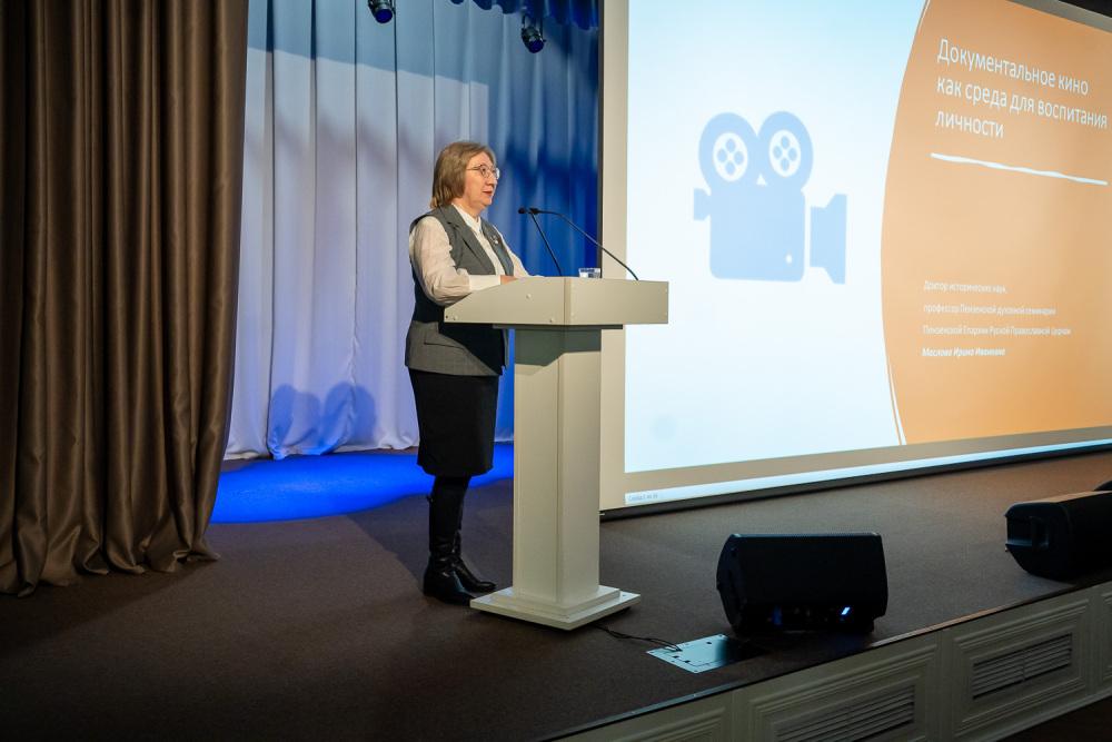 Затем свой доклад «Документальное кино как среда для воспитания личности: педагогический эксперимент (на примере российско-белорусского фильма «Приказано жить»)» представила Ирина Ивановна Маслова, доктор исторических наук, профессор Пензенской духовной семинарии, руководитель творческого объединения «Центр гражданского и патриотического воспитания». Спикер поделилась с собравшимися нестандартными, творческими решениями, применяемыми современной педагогической наукой в деле воспитания личности.