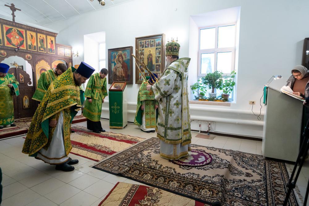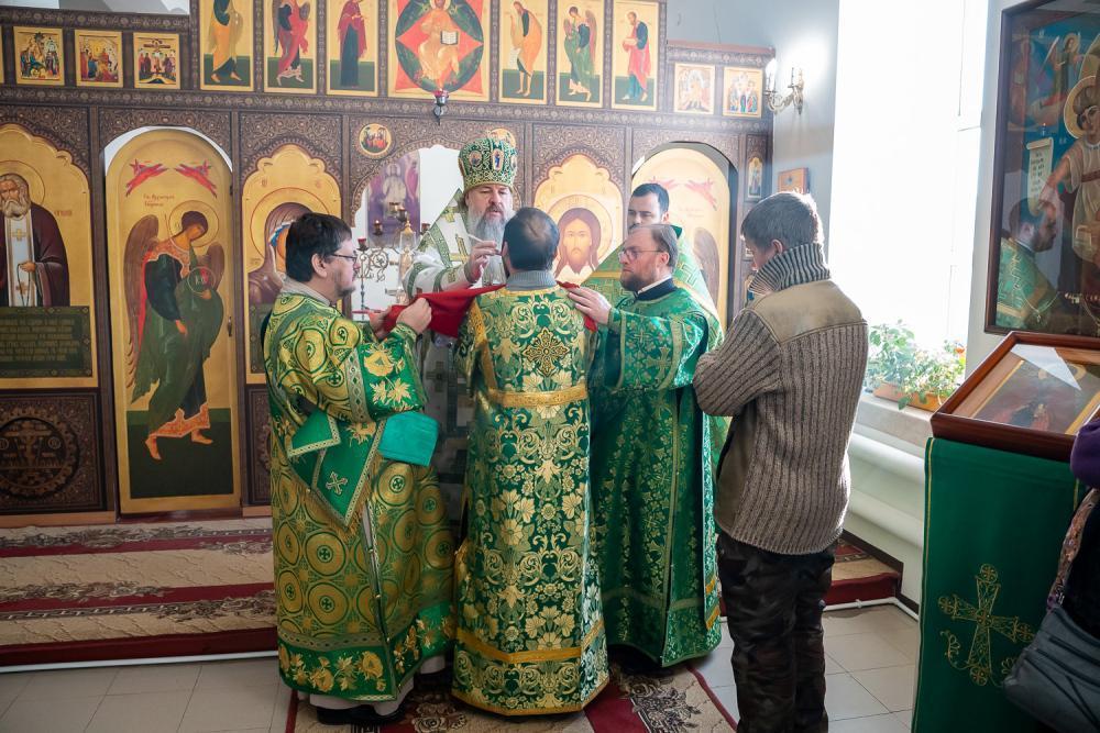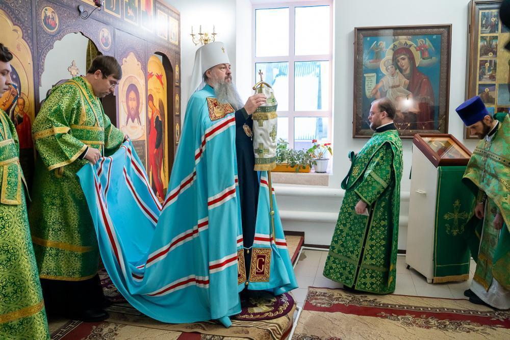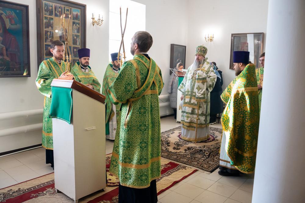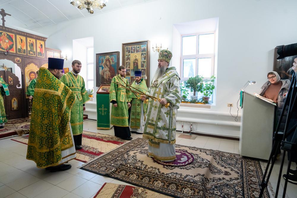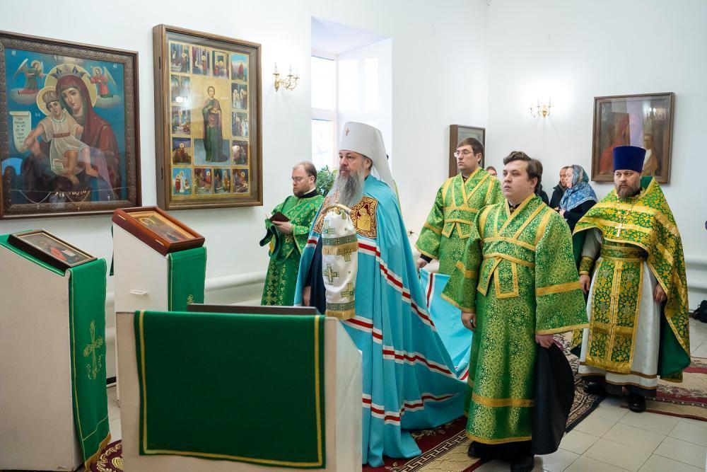 Его Высокопреосвященству сослужили протоиерей Владимир Ольхов, настоятель церкви Рождества Пресвятой Богородицы с. Канаевка иерей Даниил Добролюбов, иерей Георгий Насонов, диакон Кирилл Вейго и протодиакон Константин Кузьминых.