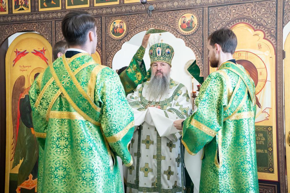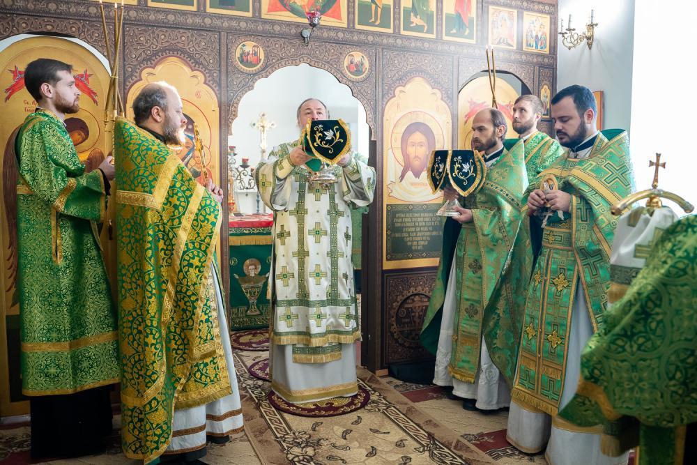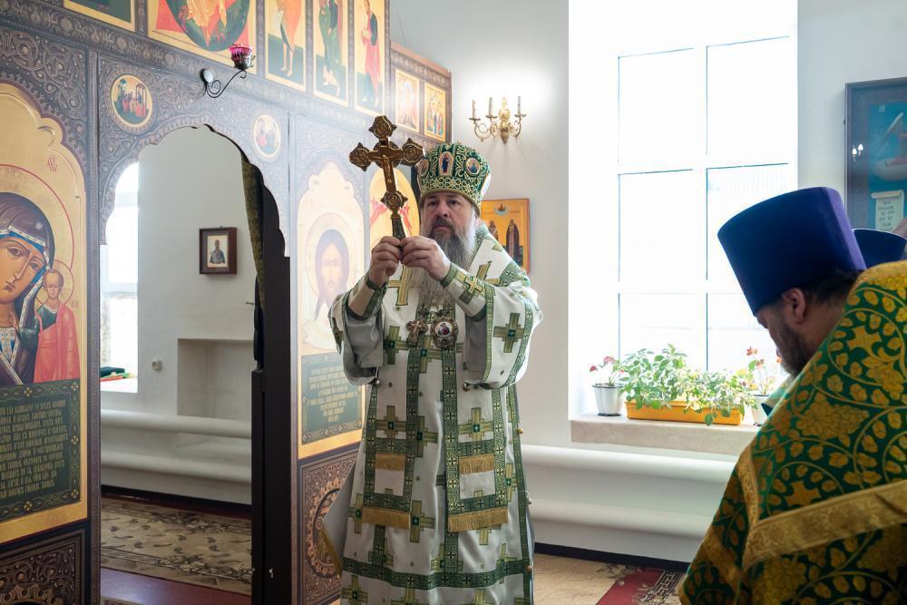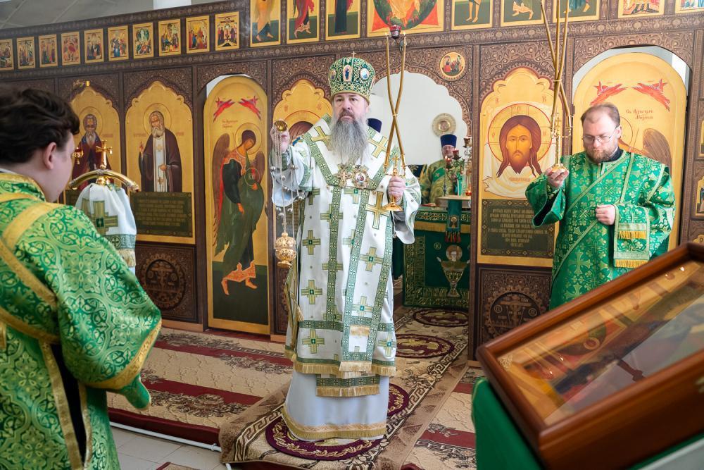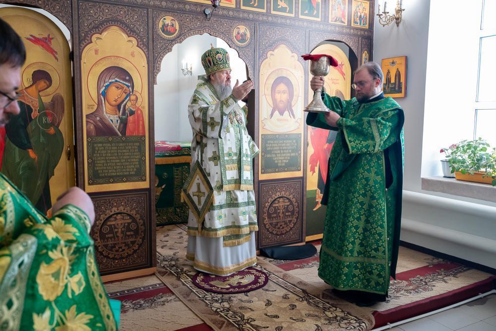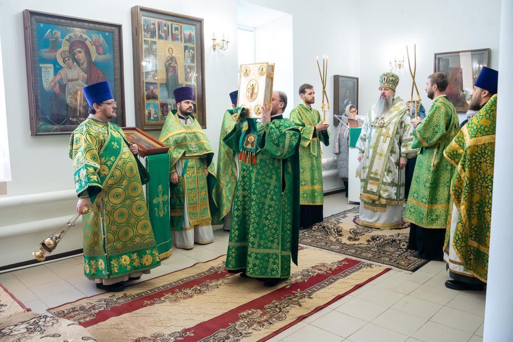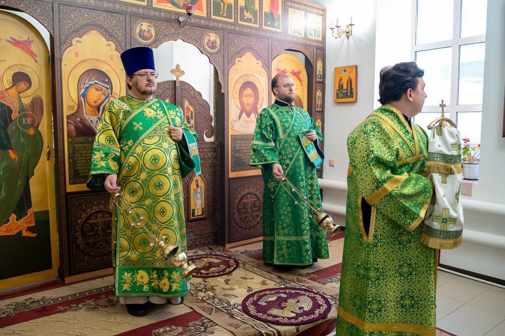Его Высокопреосвященству сослужили протоиерей Владимир Ольхов, настоятель церкви Рождества Пресвятой Богородицы с. Канаевка иерей Даниил Добролюбов, иерей Георгий Насонов, диакон Кирилл Вейго и протодиакон Константин Кузьминых.