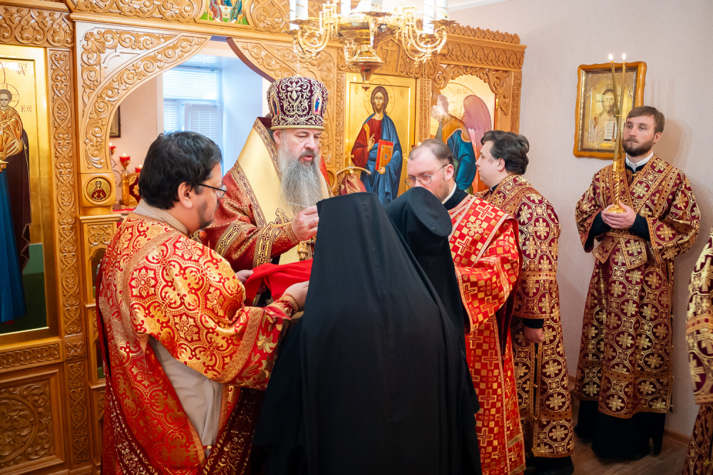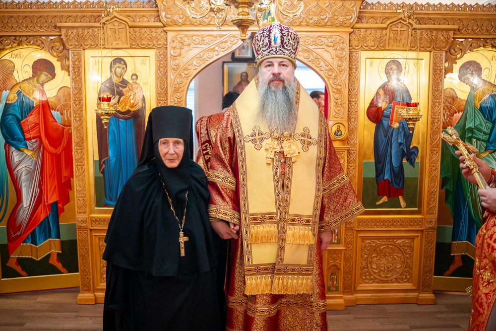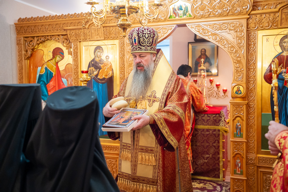Завершая богослужение, Высокопреосвященный владыка Серафим сердечно поздравил игумению Варвару с днем ее тезоименитства, пожелал крепости сил и Божией помощи, а также преподнес в дар икону Благовещения Пресвятой Богородицы и святую просфору.