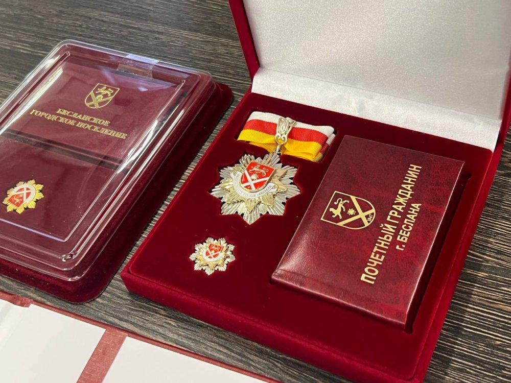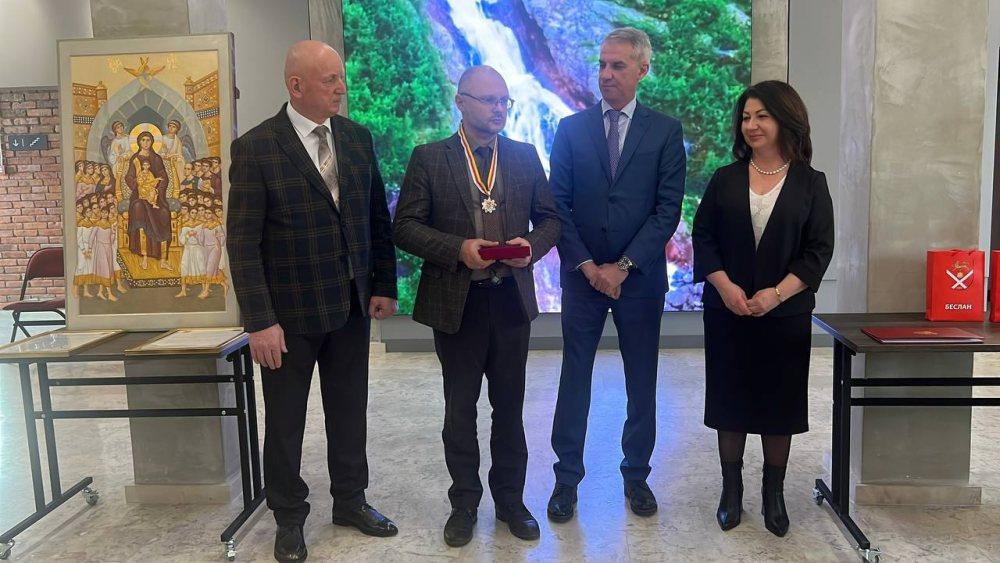 Глава г. Беслан Харитон Татров и председатель городского Собрания представителей Светлана Фидарова поблагодарили гостей за неравнодушие и вручили протоиерею Николаю Грошеву знак отличия «За заслуги перед Бесланом». Глебу Владимировичу Синцову присвоено звание «Почетный гражданин Беслана».