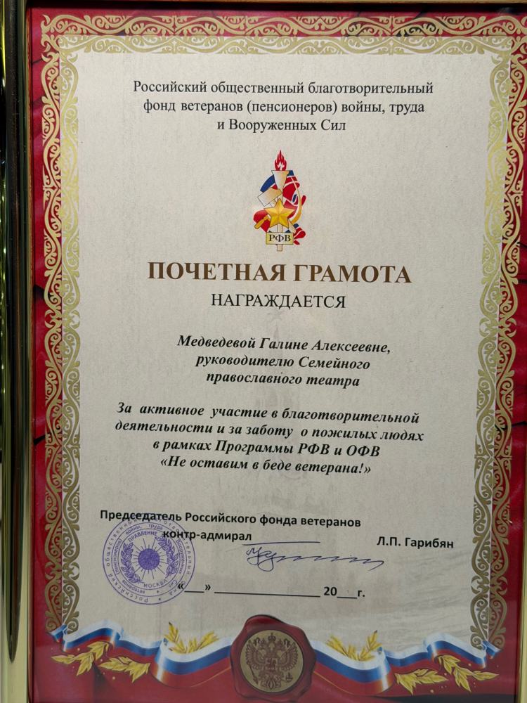В этот день ветераны с особой благодарностью отметили труд руководителя театра Галины Медведевой. Ей была вручена Почетная грамота от председателя Российского фонда ветеранов, контр-адмирала Л. П. Гарибяна, в знак признания многолетней самоотверженной работы, верности своему делу и значительного вклада в воспитание подрастающего поколения.