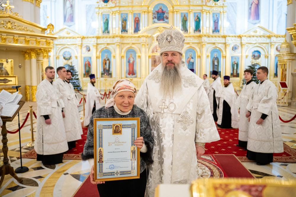 Во время утрени, по прочтении Святого Евангелия, Высокопреосвященный владыка Серафим поздравил собравшихся с воскресным днем и навечерием праздника Крещения Господня, после чего наградил хранителя Музея Пензенской епархии Любовь Николаевну Иванову архиерейской благословенной грамотой за многолетние труды по изучению и популяризации церковной истории Пензенского края и в связи с юбилеем.