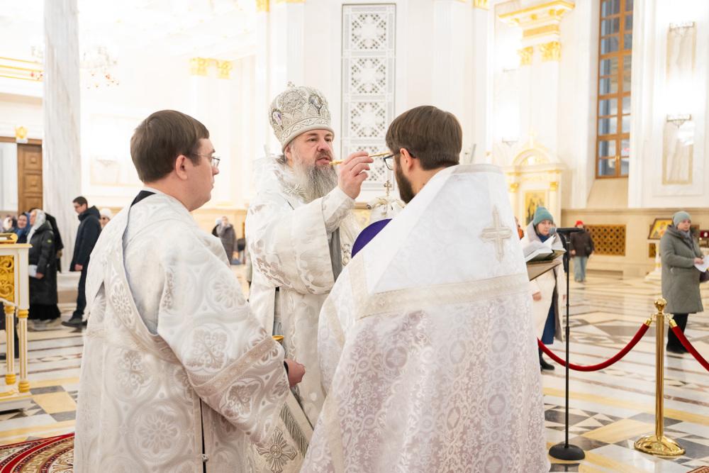 Затем правящий архипастырь помазал духовенство освященным елеем.