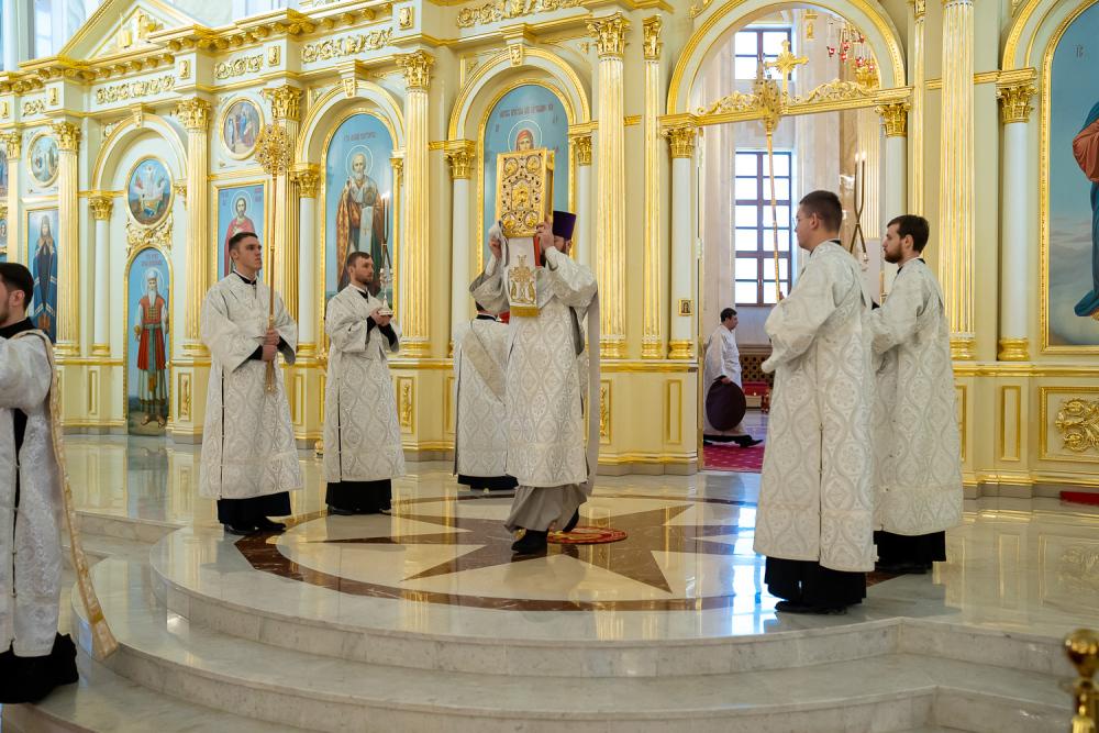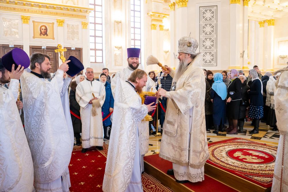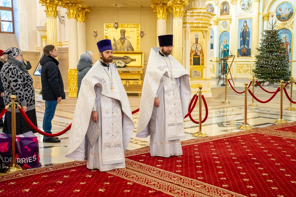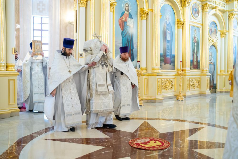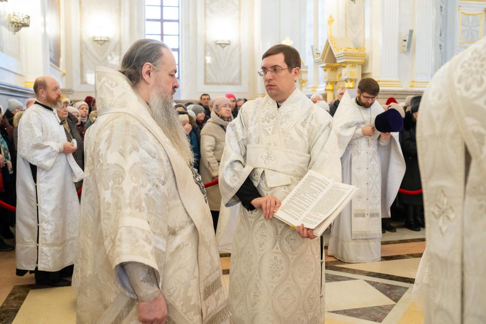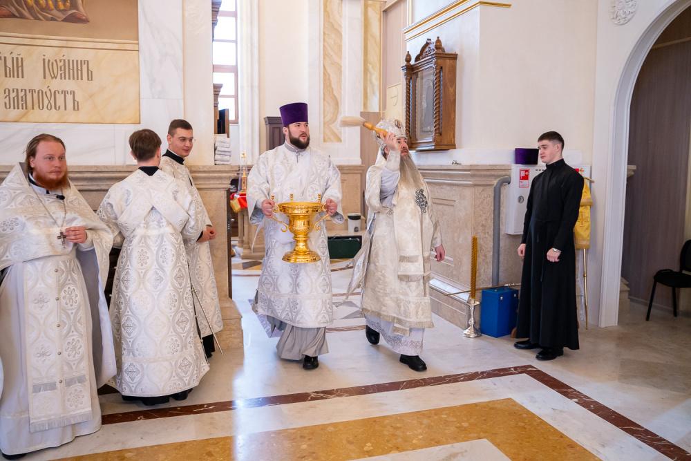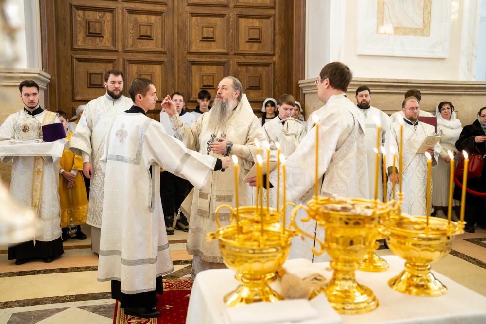 Его Высокопреосвященству сослужили ключарь Спасского кафедрального собора иерей Николай Батищев, протоиерей Владимир Ольхов, иереи Сергий Иванов, Евгений Климчев и Георгий Насонов, диаконы Богдан Яворский, Кирилл Вейго, Иоанн Сидоров, Георгий Дементьев и Никита Черных.