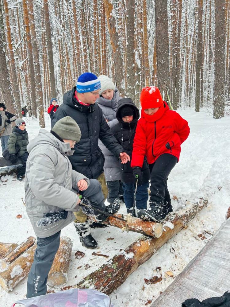Заснеженные тропы, невероятно красивые виды и – неожиданная встреча с лосем! А на стоянке мальчики учились колоть дрова топором, девочки, не желая оставаться в стороне, смело взялись за двуручную пилу и пилили ветки.