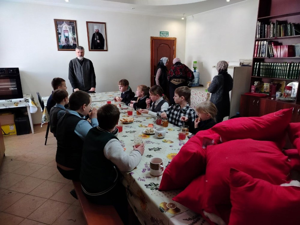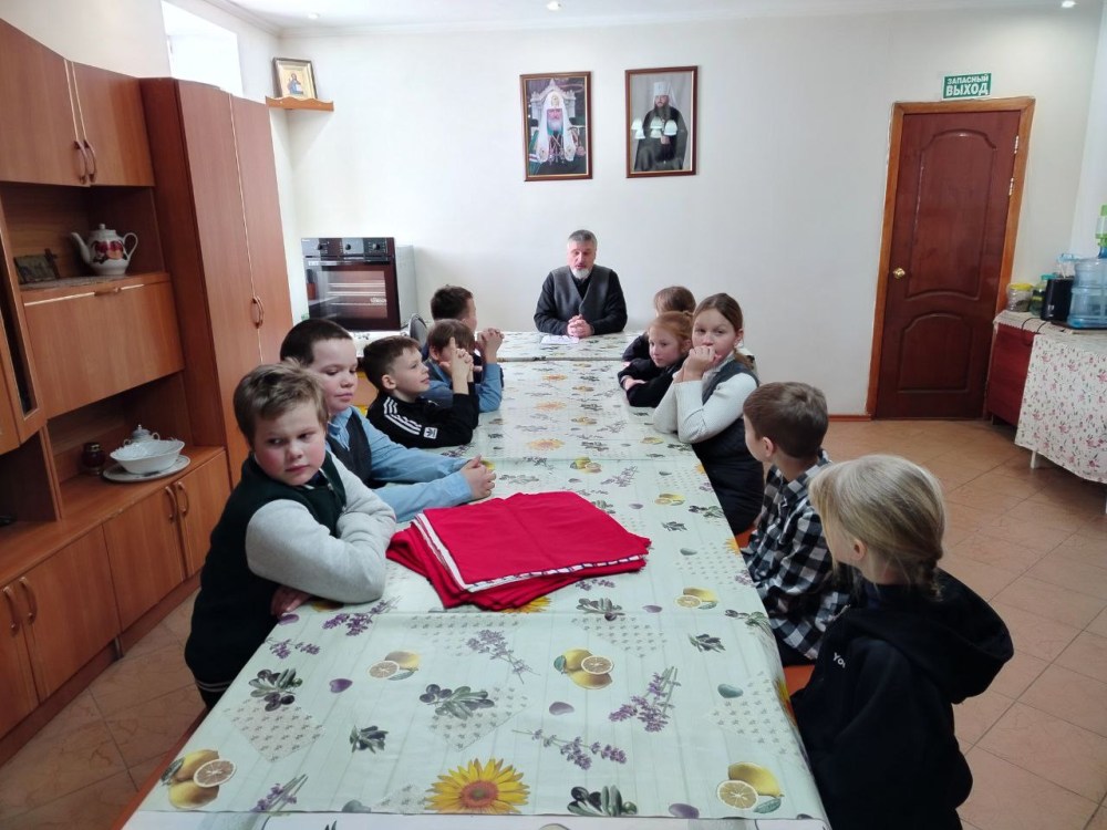 Священнослужитель рассказал детям о празднике Масленицы и познакомил их с традициями семи дней недели перед Прощеным воскресеньем. Также отец Роман поговорил о проблеме сквернословия и его последствиях для духовной жизни человека.