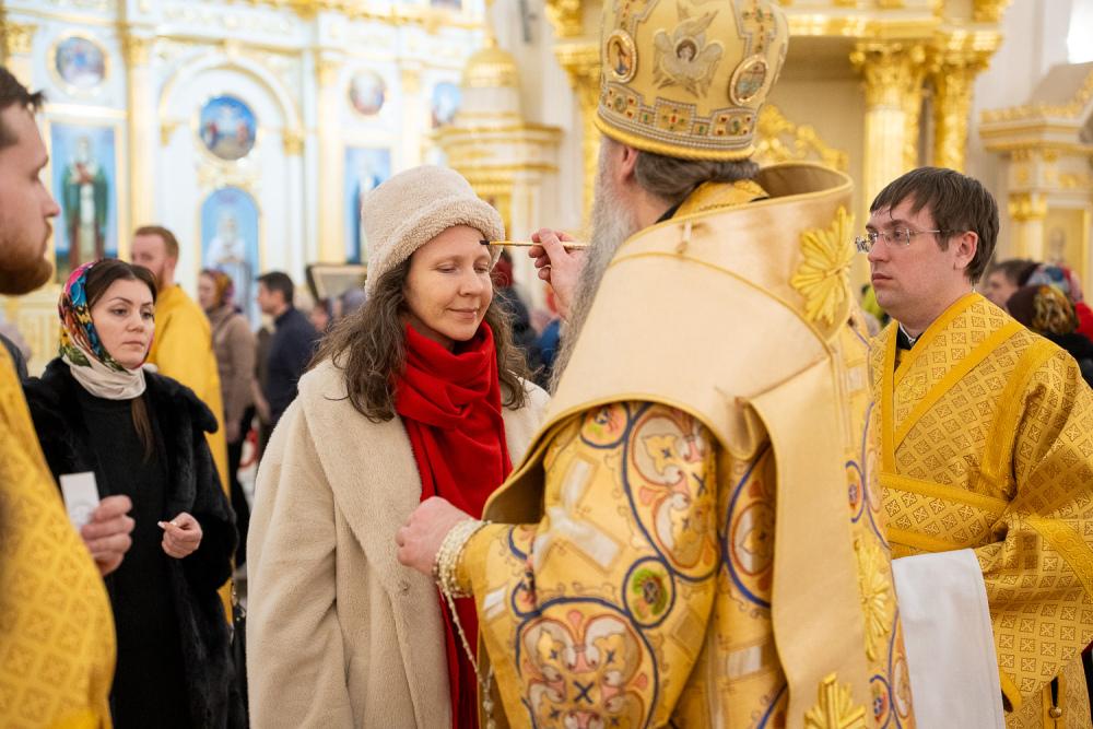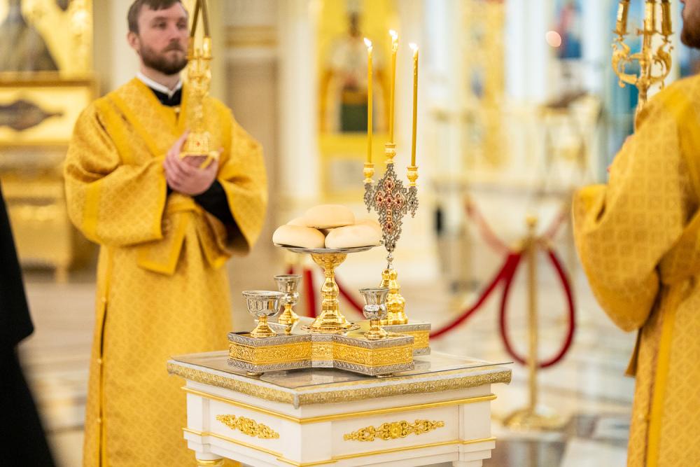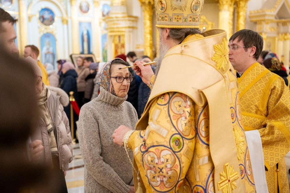 За вечерним богослужением Высокопреосвященный владыка Серафим совершил литию с освящением хлебов, пшеницы, вина и елея. Во время утрени, по прочтении Святого Евангелия, правящий архипастырь помазал верующих освященным на Гробе Господнем святым елеем, который Высокопреосвященный владыка привез из паломнической поездки на Святую Землю.