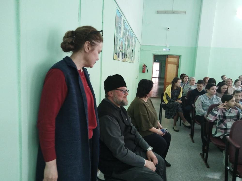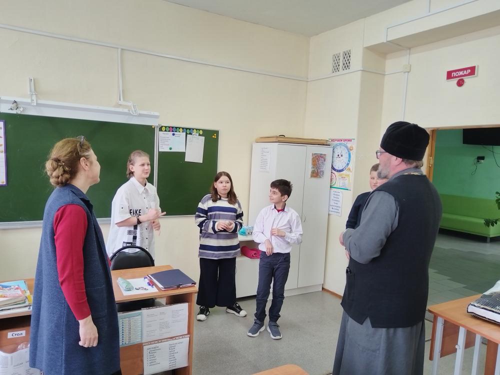 Учащиеся начальной школы исполнили для гостей веселый танец, после чего иерей Владислав побеседовал с детьми о Боге, о семье, о поведении, обсудив, что такое хорошо и что такое плохо. Старшие классы активно участвовали в беседе. После этого с рассказом-презентацией о зимних церковных праздниках и о Прощеном воскресении выступила Ольга Александровна Аблаева.