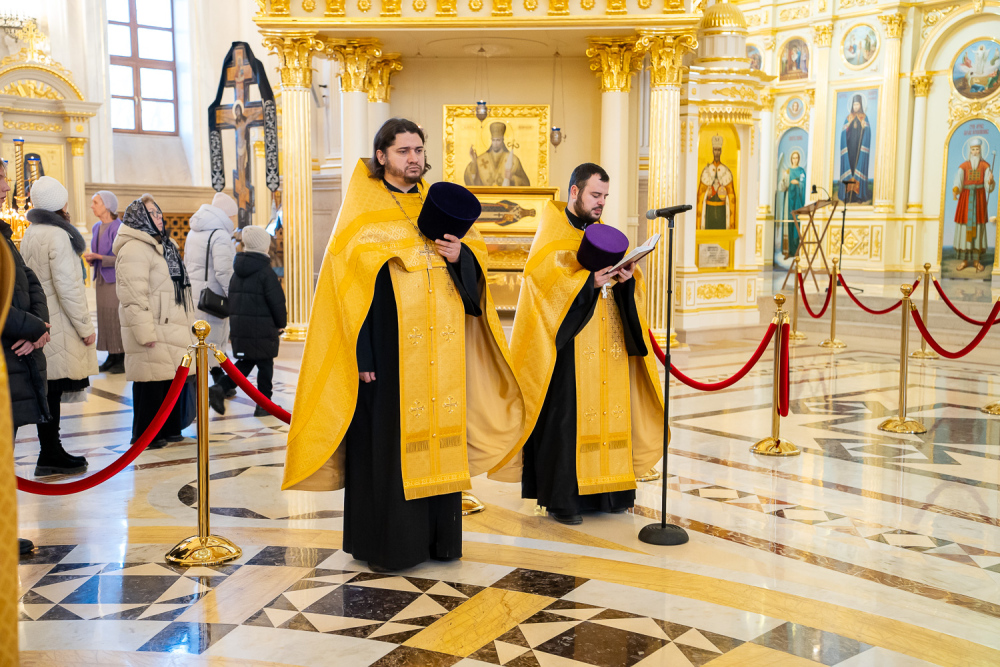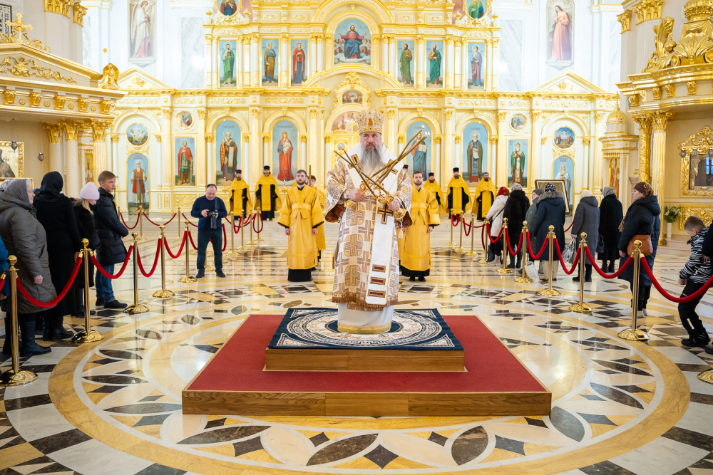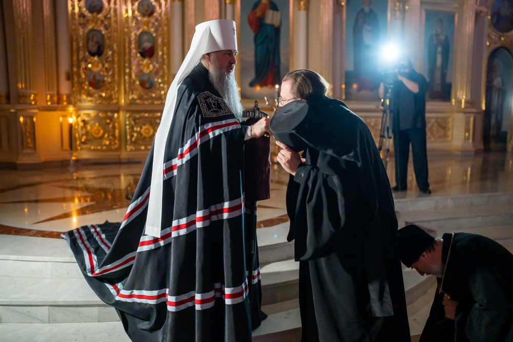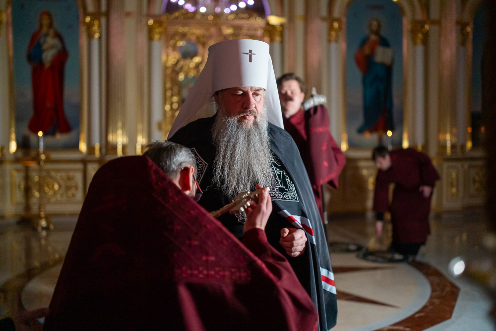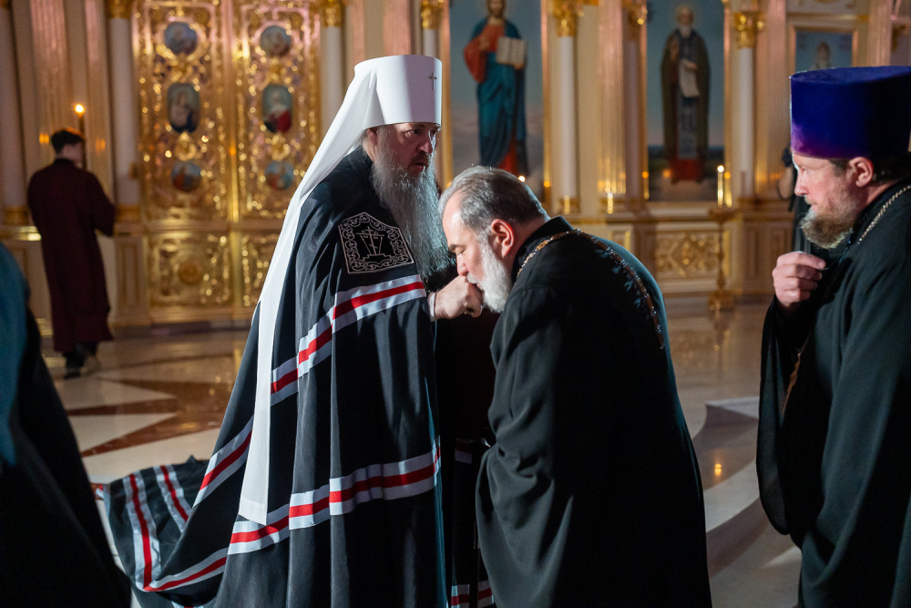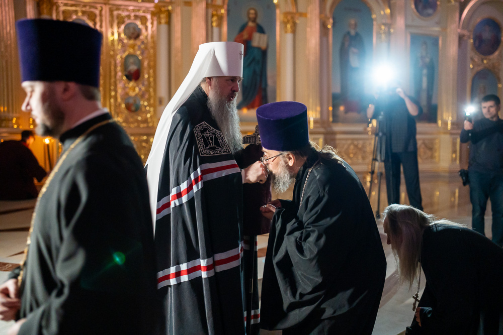 Затем правящий архипастырь прочитал молитву на начало поста Святой Четыредесятницы, после чего преподал крест для целования духовенству и мирянам, которые подходили к владыке, чтобы получить благословение на прохождение Великого поста.