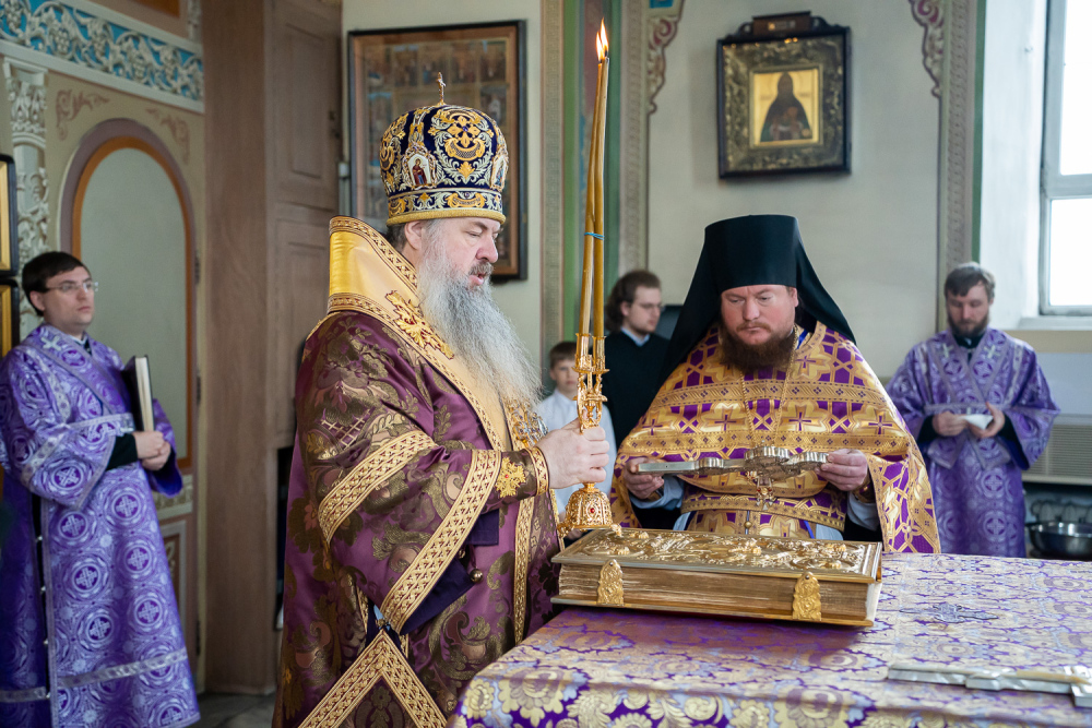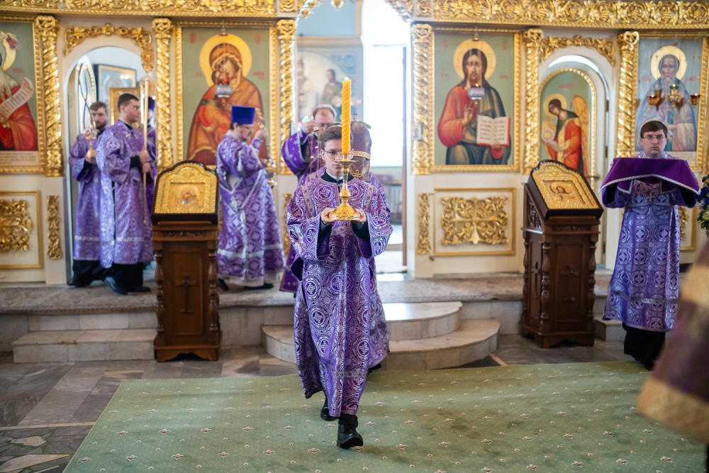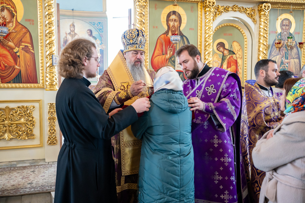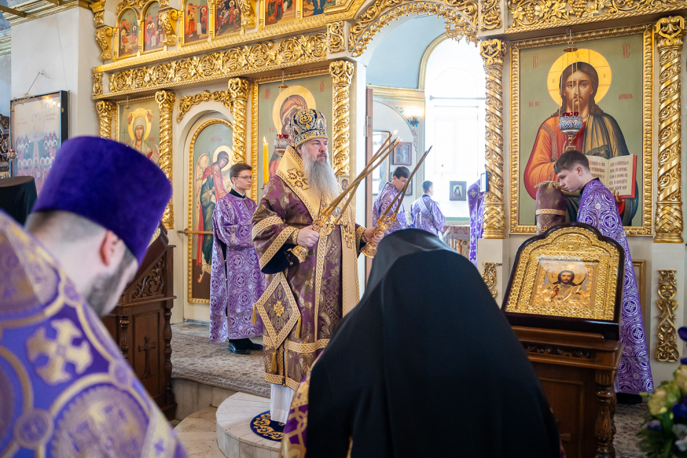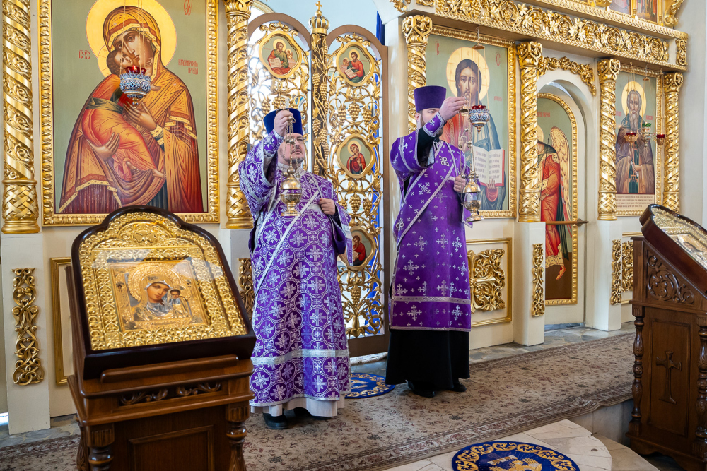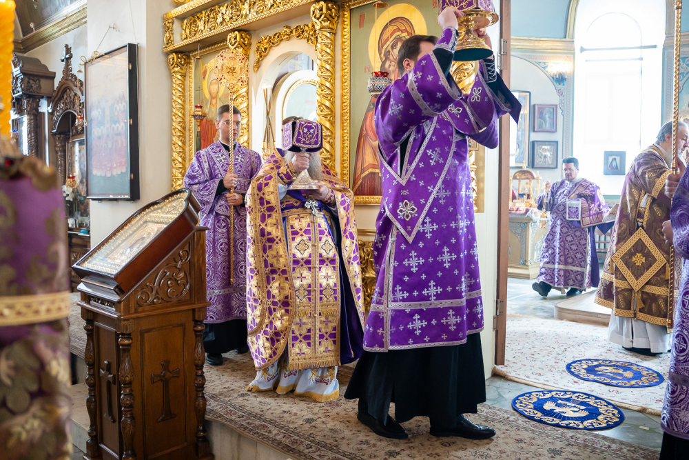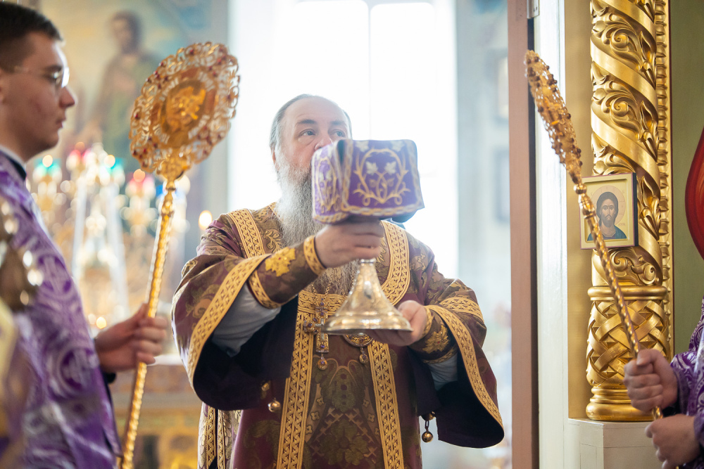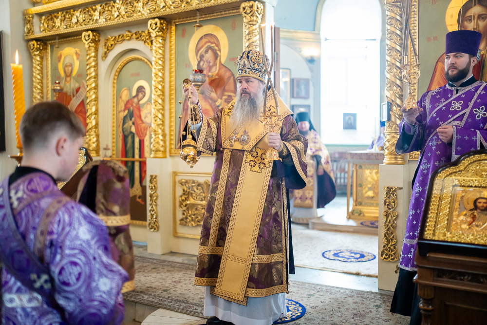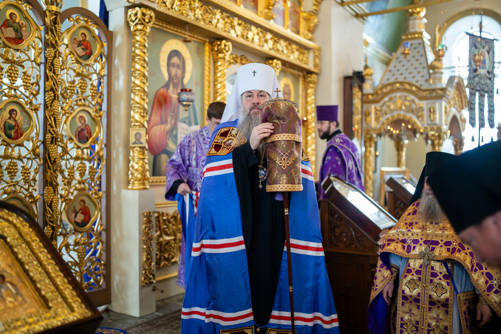 Его Высокопреосвященству сослужили настоятель Сергиевского храма игумен Христофор (Ширяев), иеромонах Иоанн (Клыченков), иерей Георгий Насонов, диакон Богдан Яворский, протодиакон Константин Кузьминых и диакон Кирилл Вейго.