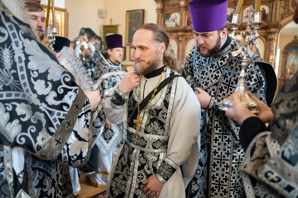 На малом входе во внимание к усердным трудам во славу Святой Церкви и ко дню Святой Пасхи по представлению правящего архиерея, Святейшим Патриархом Московским и всея Руси Кириллом иерей Валерий Кучин был удостоен права ношения палицы.