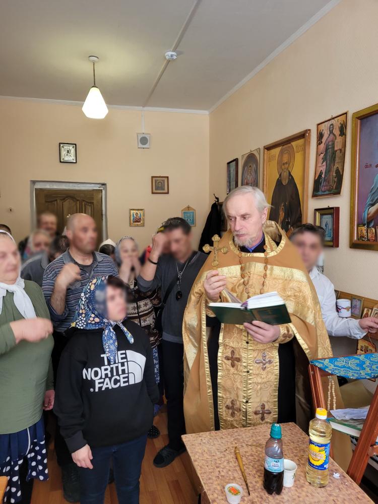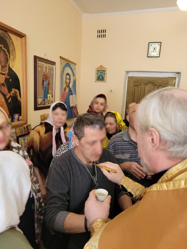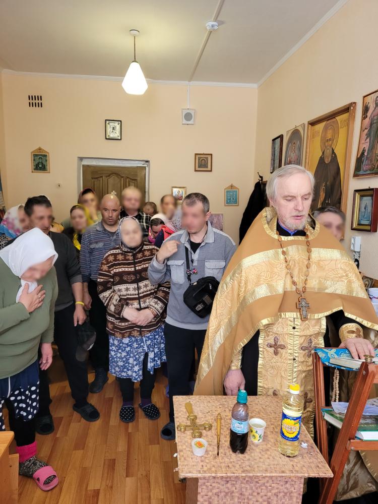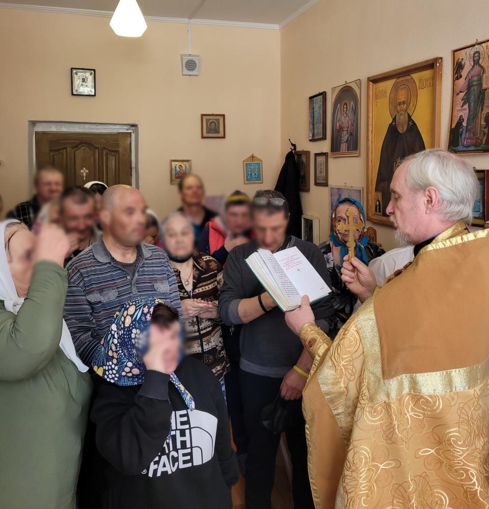 В молельной комнате он совершил для проживающих здесь общую исповедь и Таинство Елеосвящения (Соборования).