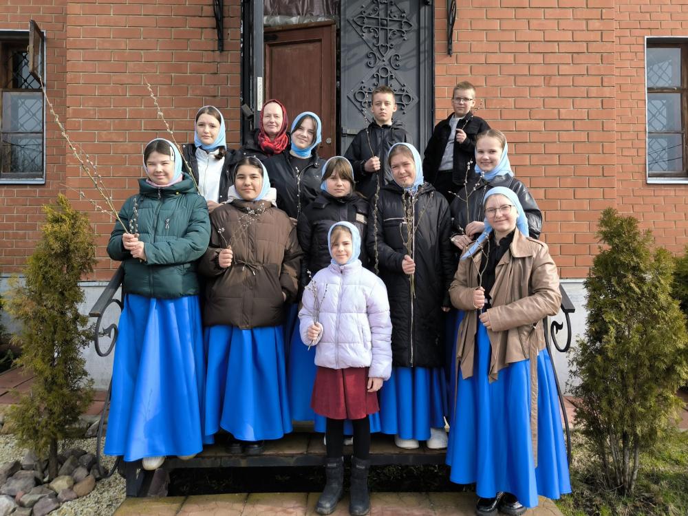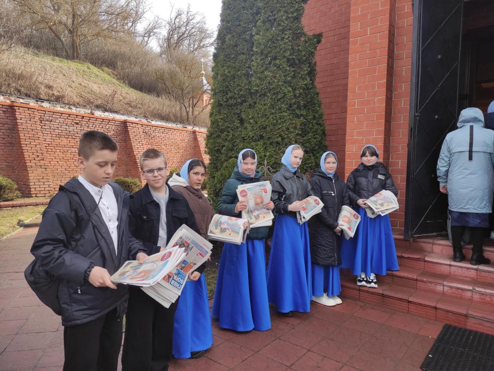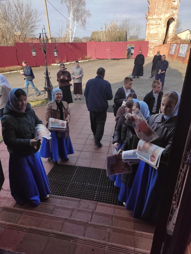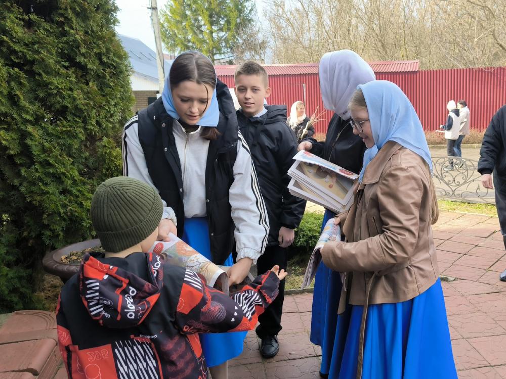 После Божественной литургии воспитанники Духовно-просветительского центра «Исток» сердечно поздравили прихожан с праздником и с приближающейся Пасхой. Дети раздавали всем желающим просветительскую литературу, неся весть о грядущем Воскресении Христовом.