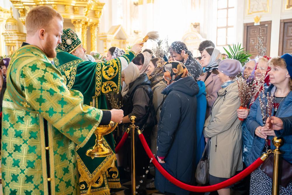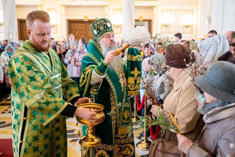 По отпусте литургии глава Пензенской митрополии совершил славление празднику Входа Господня в Иерусалим, после чего окропил ветви верб святой водой.