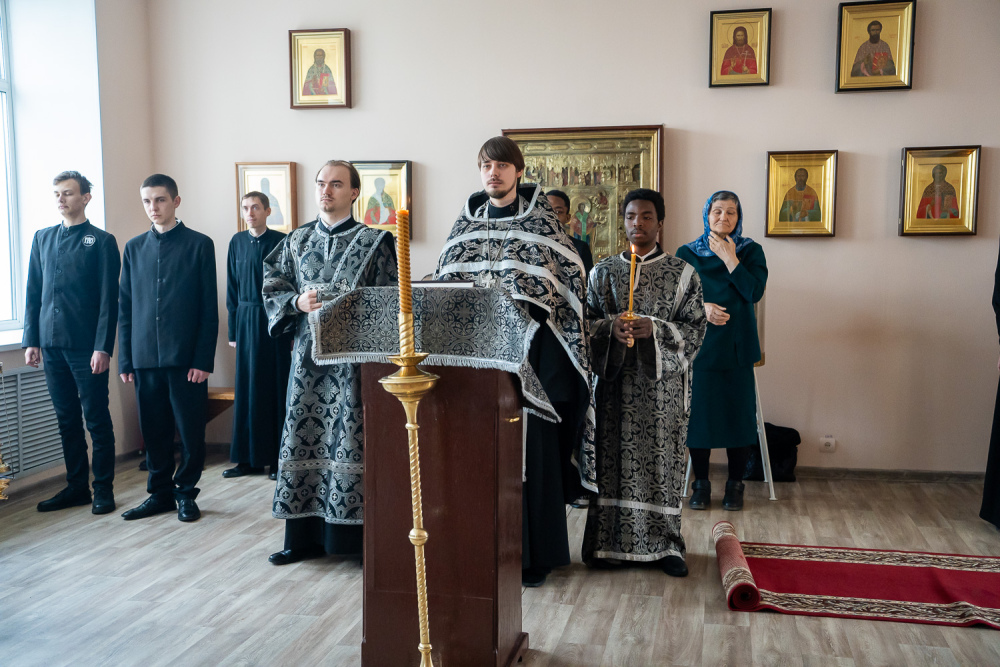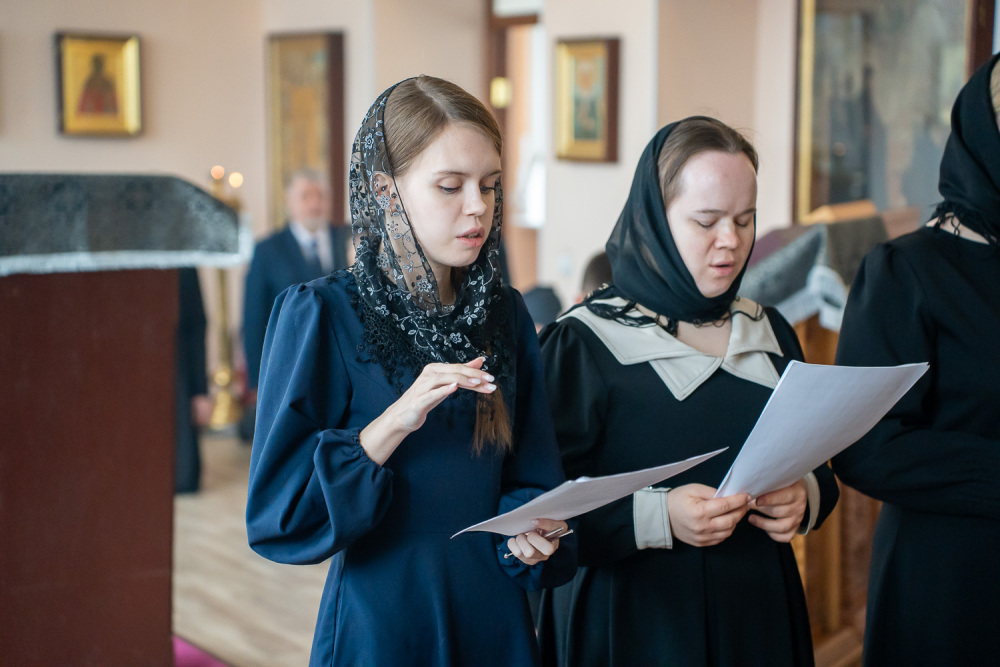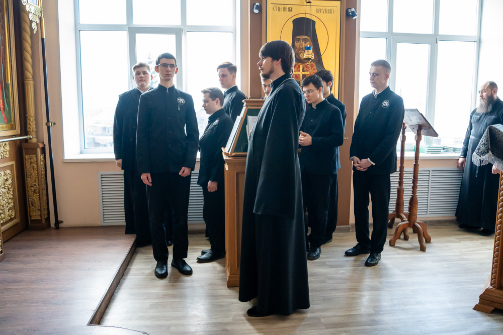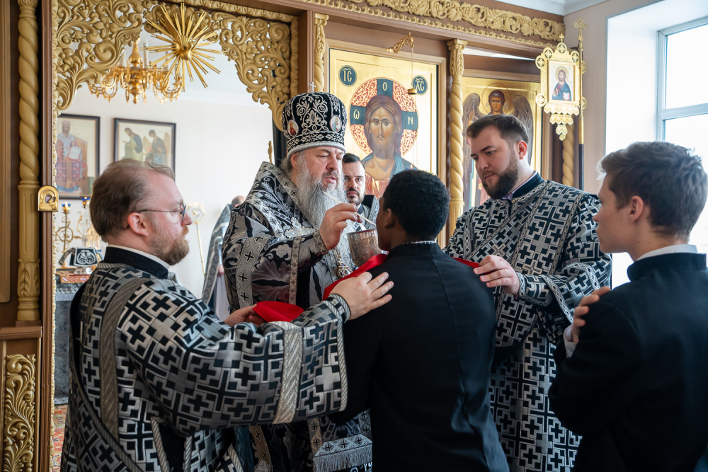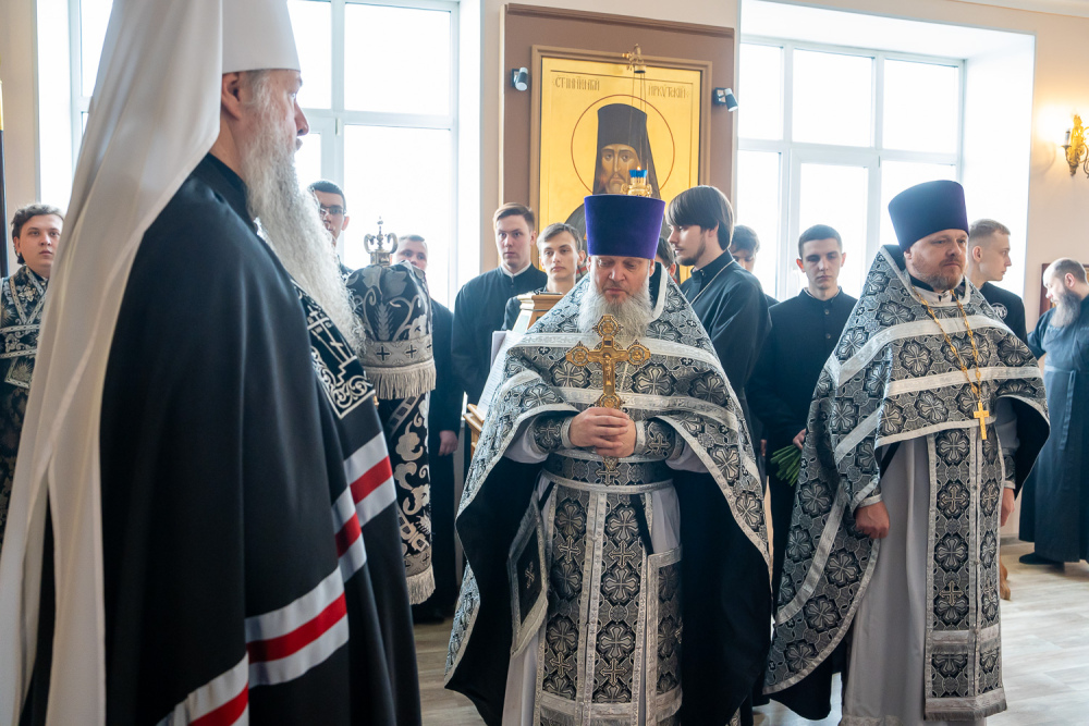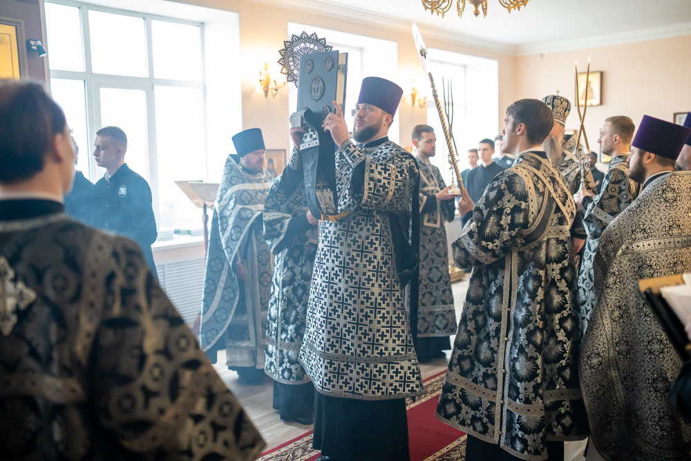 Его Высокопреосвященству сослужили ректор ПДС протоиерей Николай Грошев, первый проректор и проректор по воспитательной работе ПДС протоиерей Александр Филиппов, иереи Максим Кузнецов и Георгий Насонов, диаконы Богдан Яворский, Кирилл Вейго и Олег Шештанов.