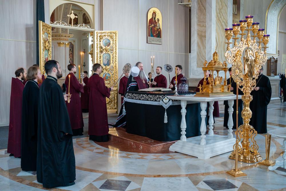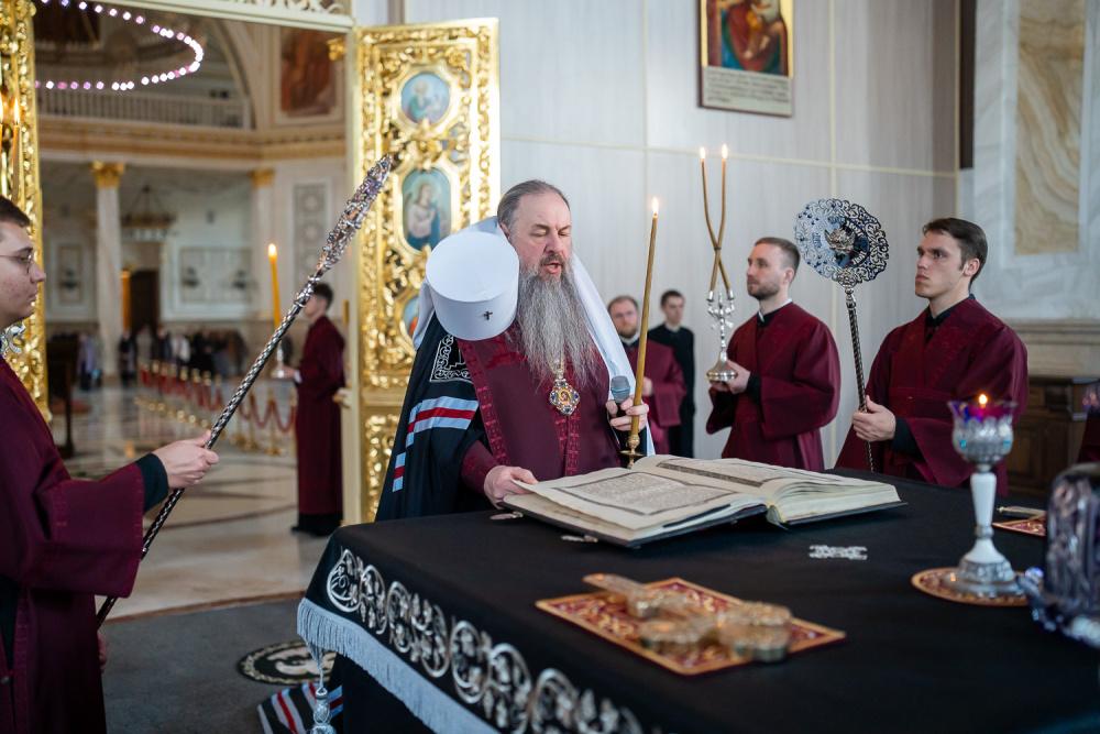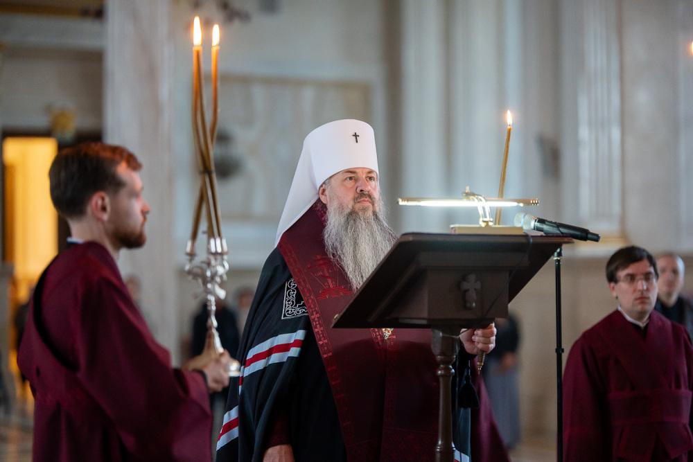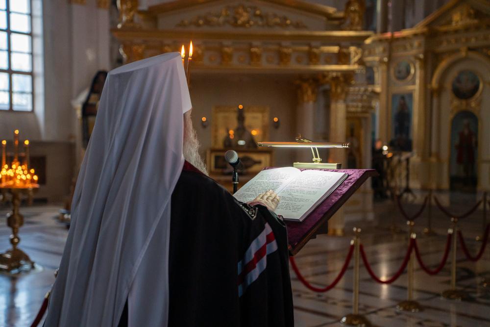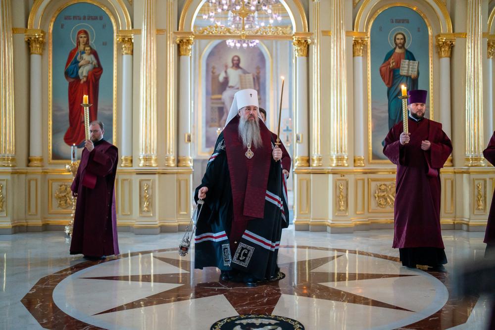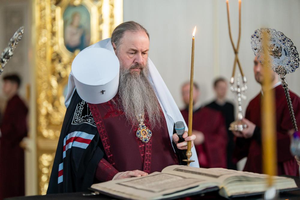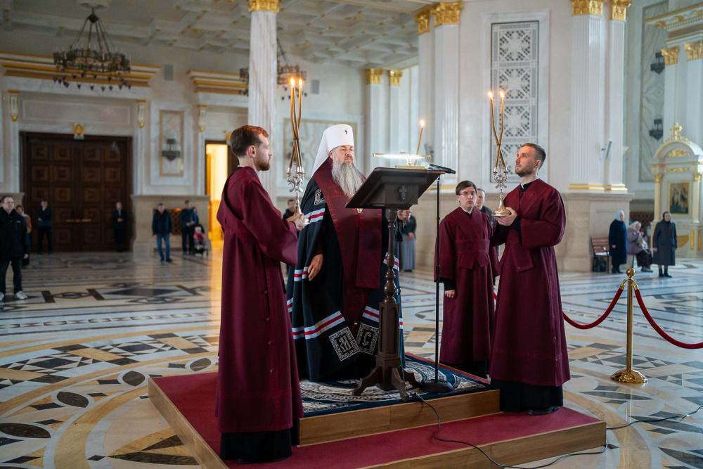 В канун среды Страстной седмицы митрополит Серафим молился за уставным богослужением в Спасском кафедральном соборе