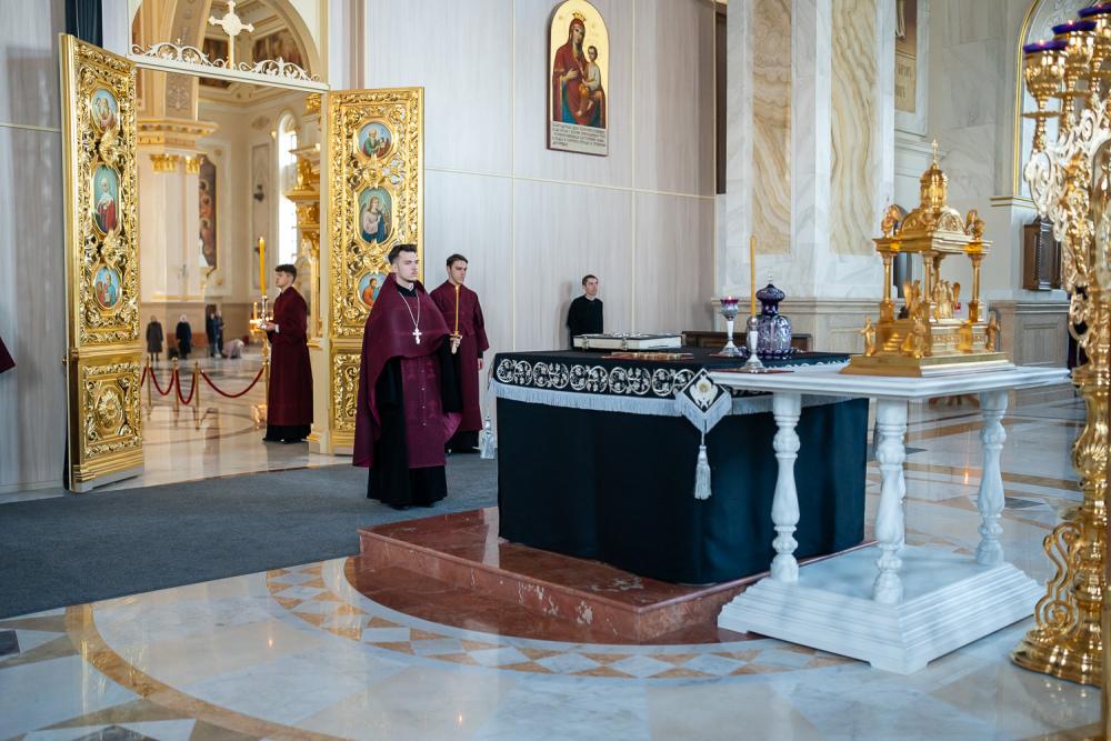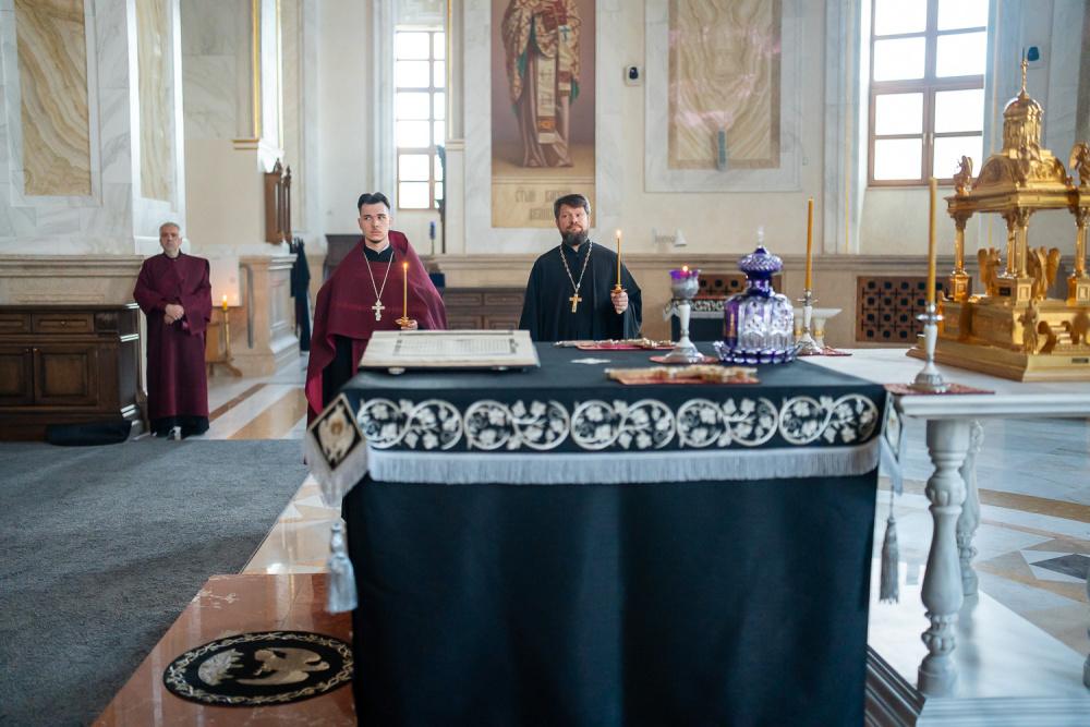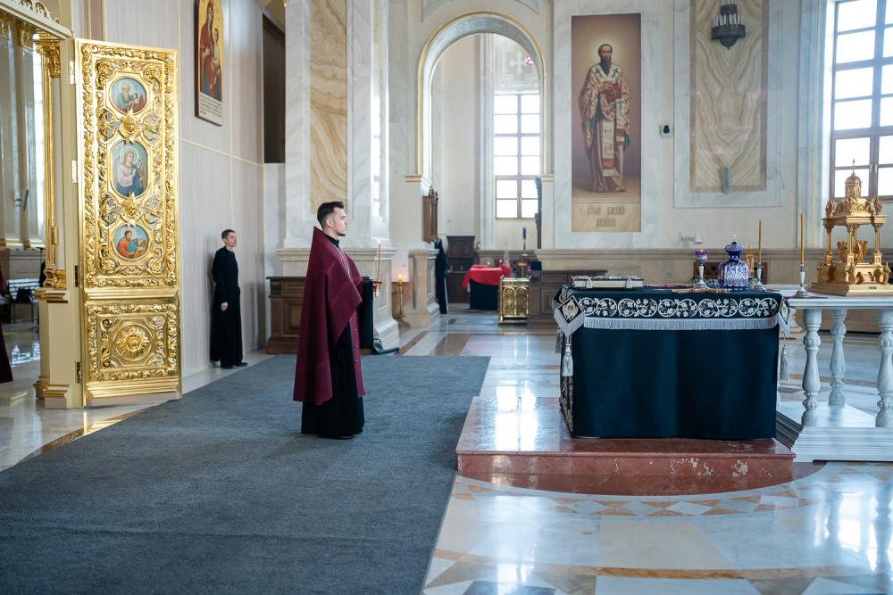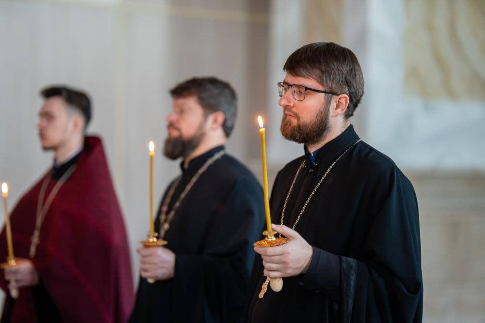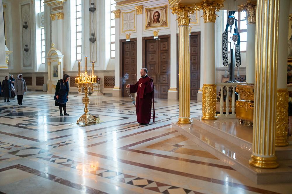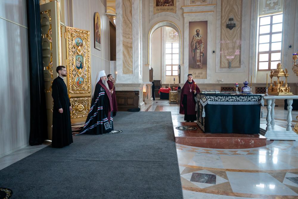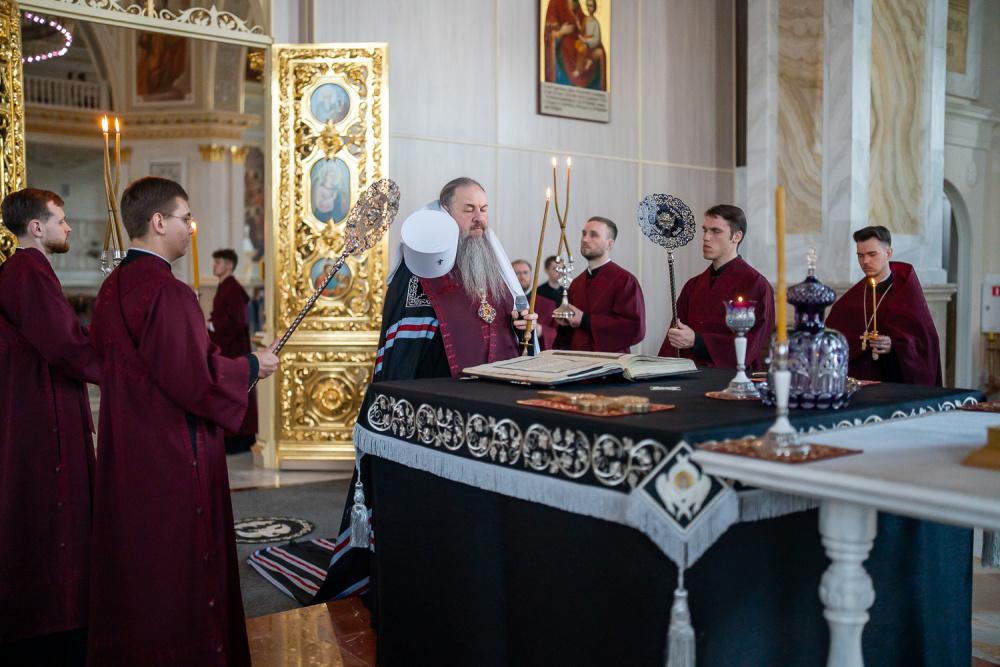 В канун среды Страстной седмицы митрополит Серафим молился за уставным богослужением в Спасском кафедральном соборе