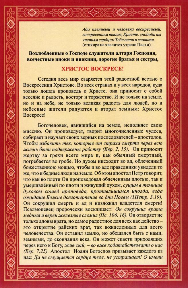 В этот замечательный праздников праздник пусть ничто не препятствует этой великой радости. Если ты счастлив – усугубь свое счастье пасхальным торжеством. Если ты несчастен – забудь все свои скорби земные и радуйся об отверстом для тебя небе. Если осознаешь себя грешником – не говори сегодня об этом: у Воскресшего сегодня все праведники! Давайте сегодня все вместе объединимся в одной радости – о торжествующей правде Единого праведника! Воздадим хвалу благому Утешителю нашему, Который подает мир и покой как умам испытующим, так и сердцам верующим, как нуждающимся в покое совести, так и обуреваемым бедами земной жизни.