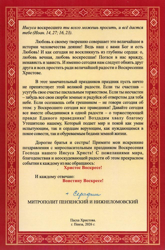 Пасхальное послание митрополита Пензенского и Нижнеломовского Серафима клиру, монашествующим и боголюбивой пастве Пензенской епархии Русской Православной Церкви
