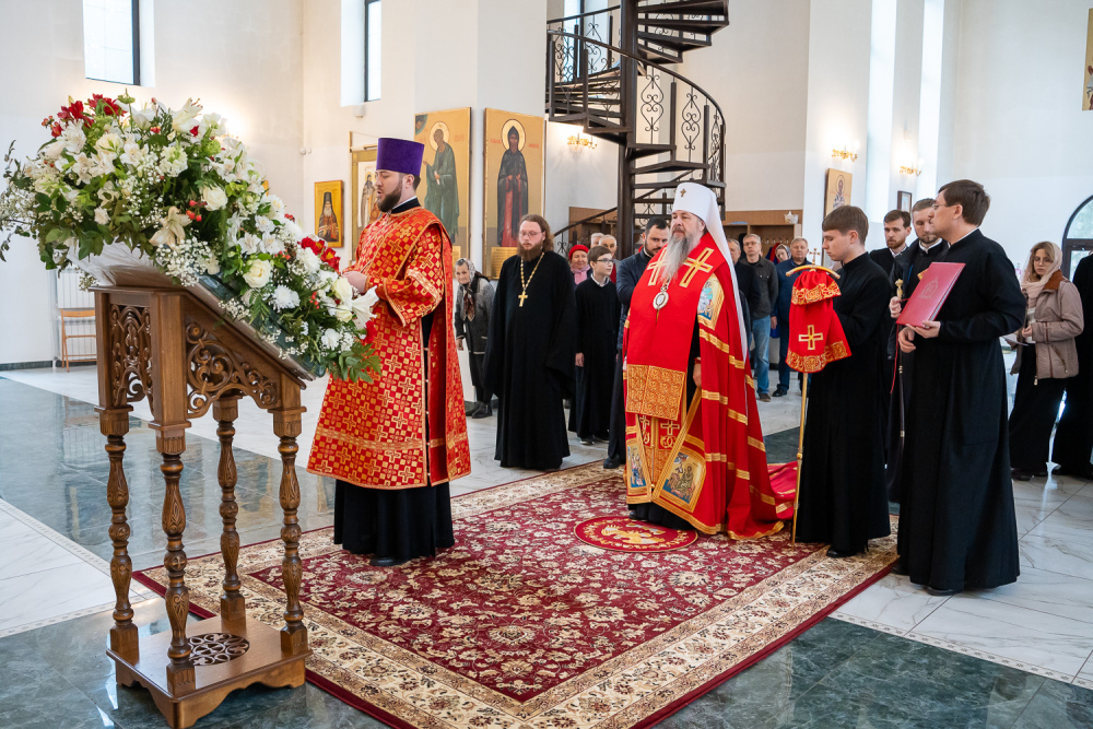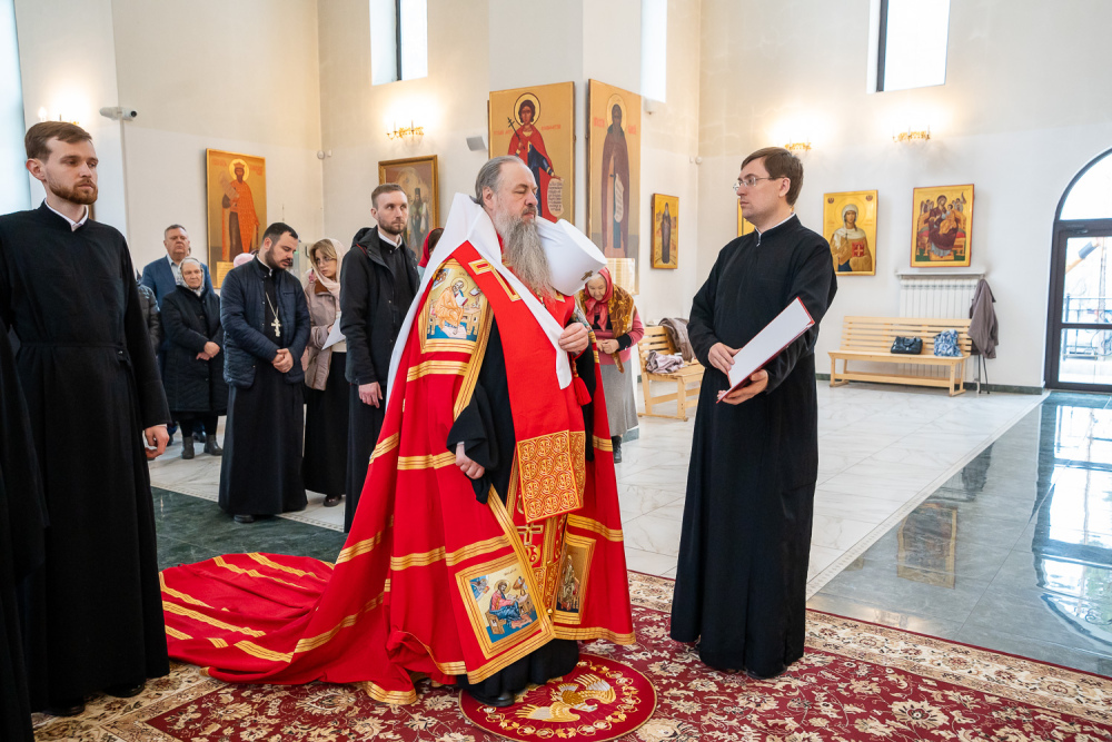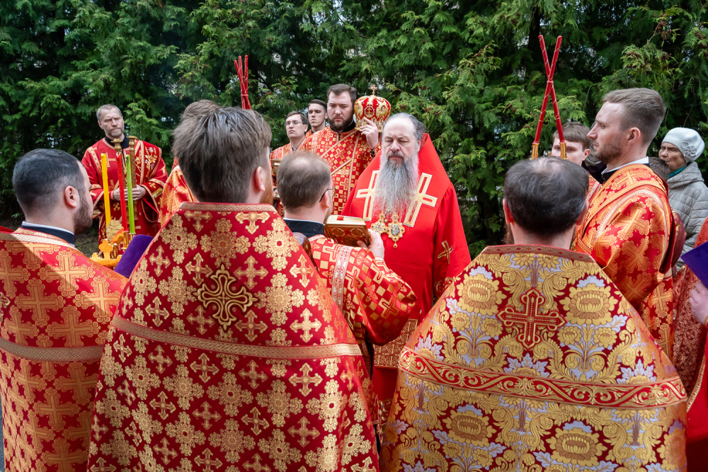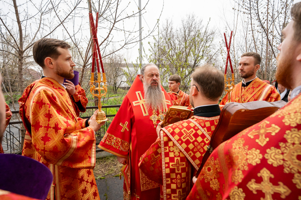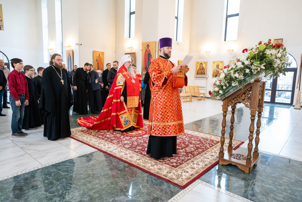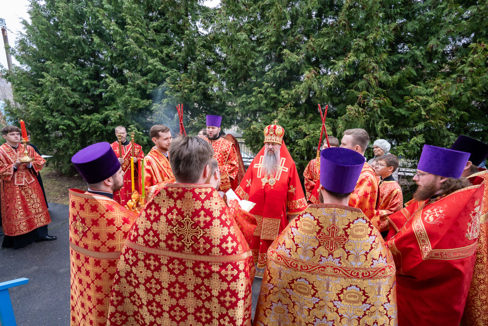 Высокопреосвященный владыка Серафим обратился к присутствующим: «Мы собрались здесь сегодня для того, чтобы помолиться Богу о начале добрых дел, которые мы будем совершать. Это роспись храма, которая начнется в ближайшее время, и благоустройство всей прилегающей территории общей площадью 5,5 гектар, которое уже началось. И я надеюсь, что нашими с вами молитвами Господь поможет нам без каких-либо особых препятствий, без искушений совершить эти добрые дела. Давайте помолимся, чтобы Господь укрепил вех нас на совершение этого доброго дела и помог в том, чтобы совершить всё это качественно и быстро».