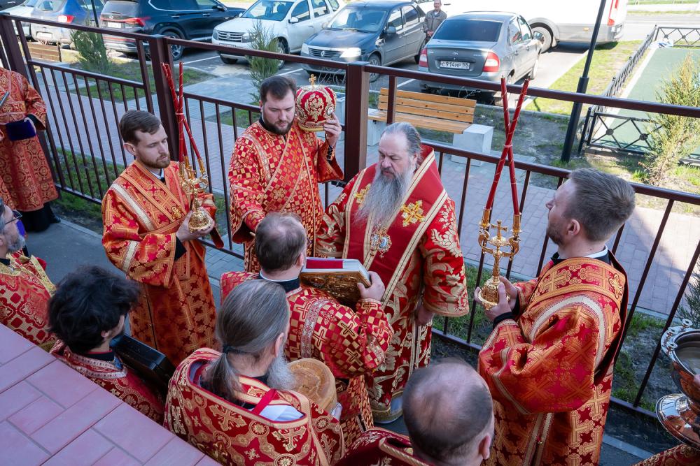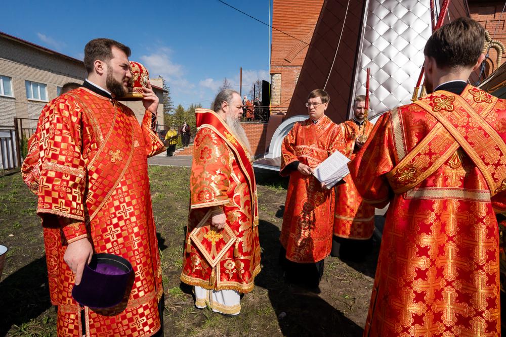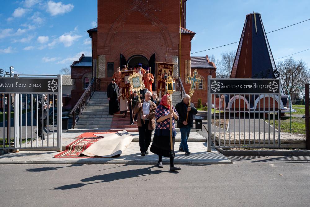 По заамвонной молитве был совершен пасхальный крестный ход, во время которого Высокопреосвященный владыка Серафим совершил освящение накупольного креста на купол колокольни Никольского храма.